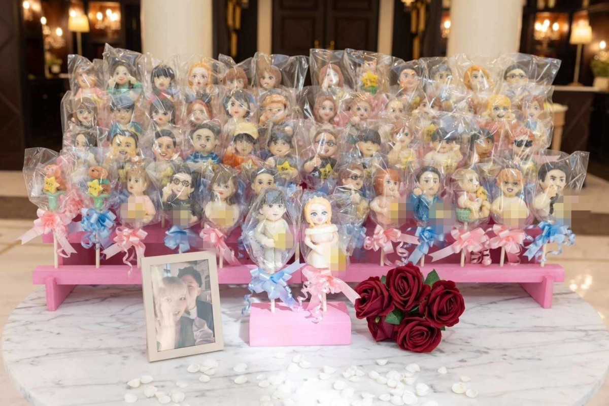 結婚披露宴の、新郎新婦さま、参列者の皆様の似顔絵飴細工を製作いたしました🍭
